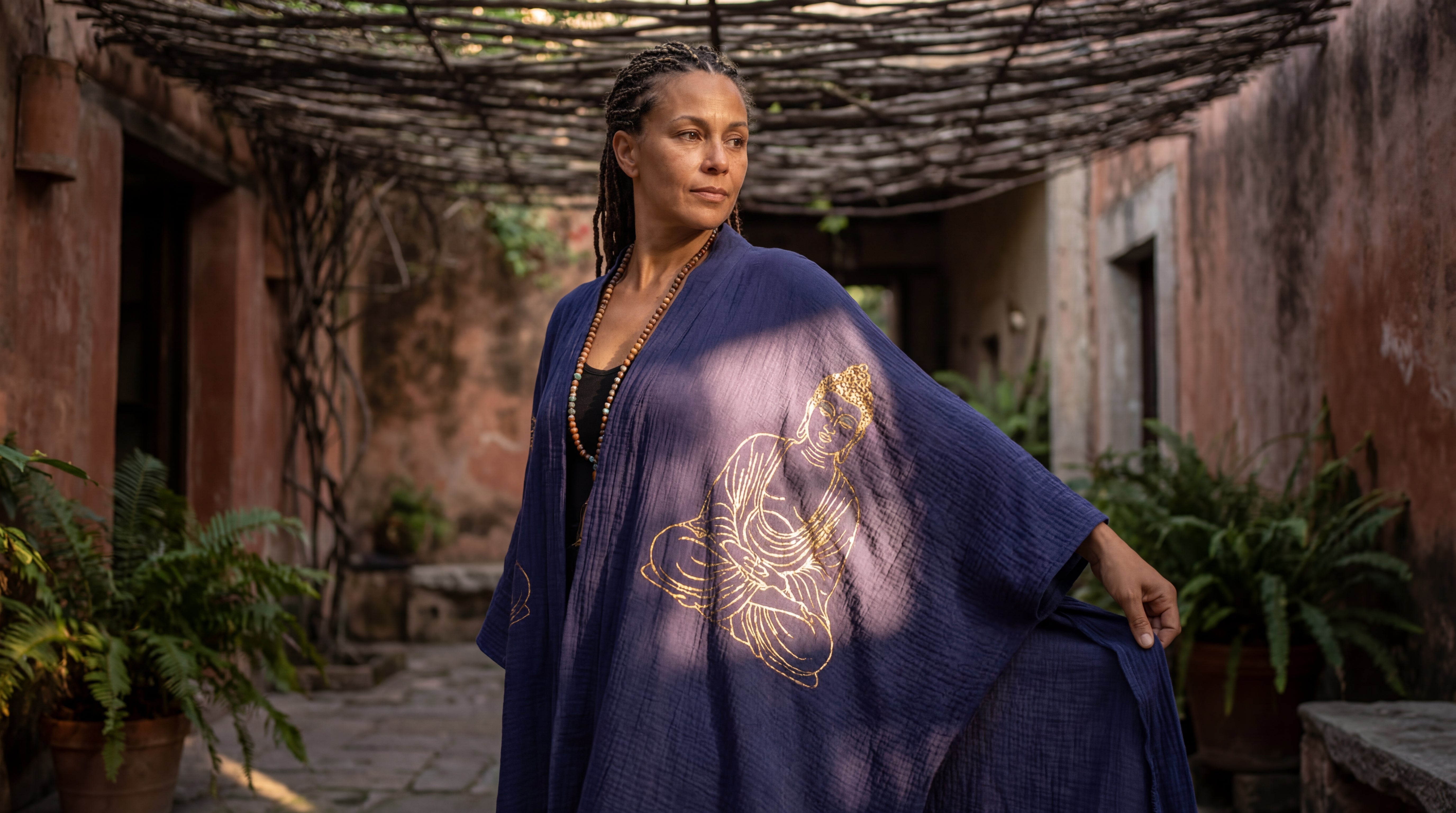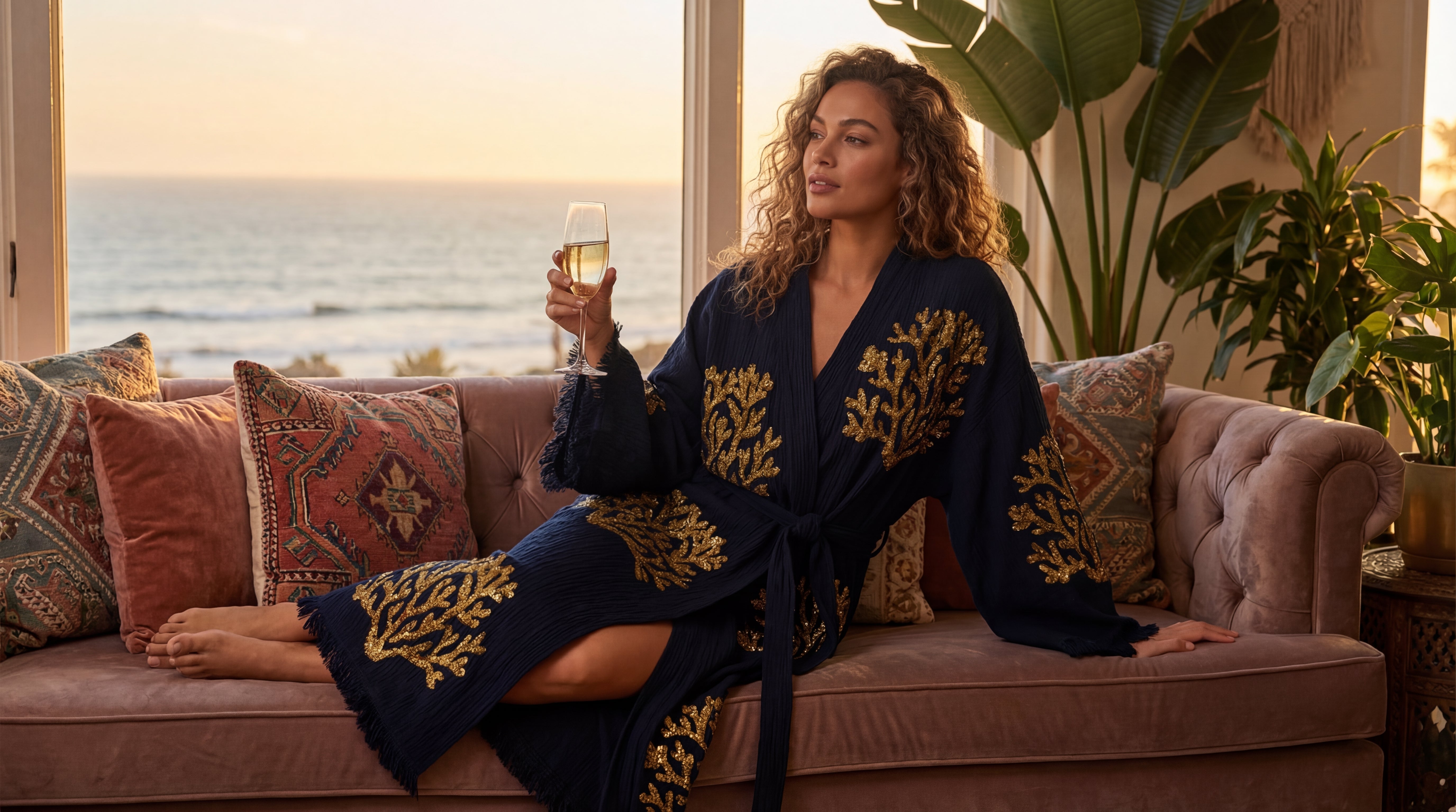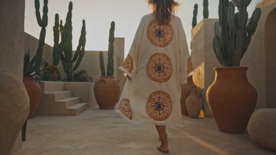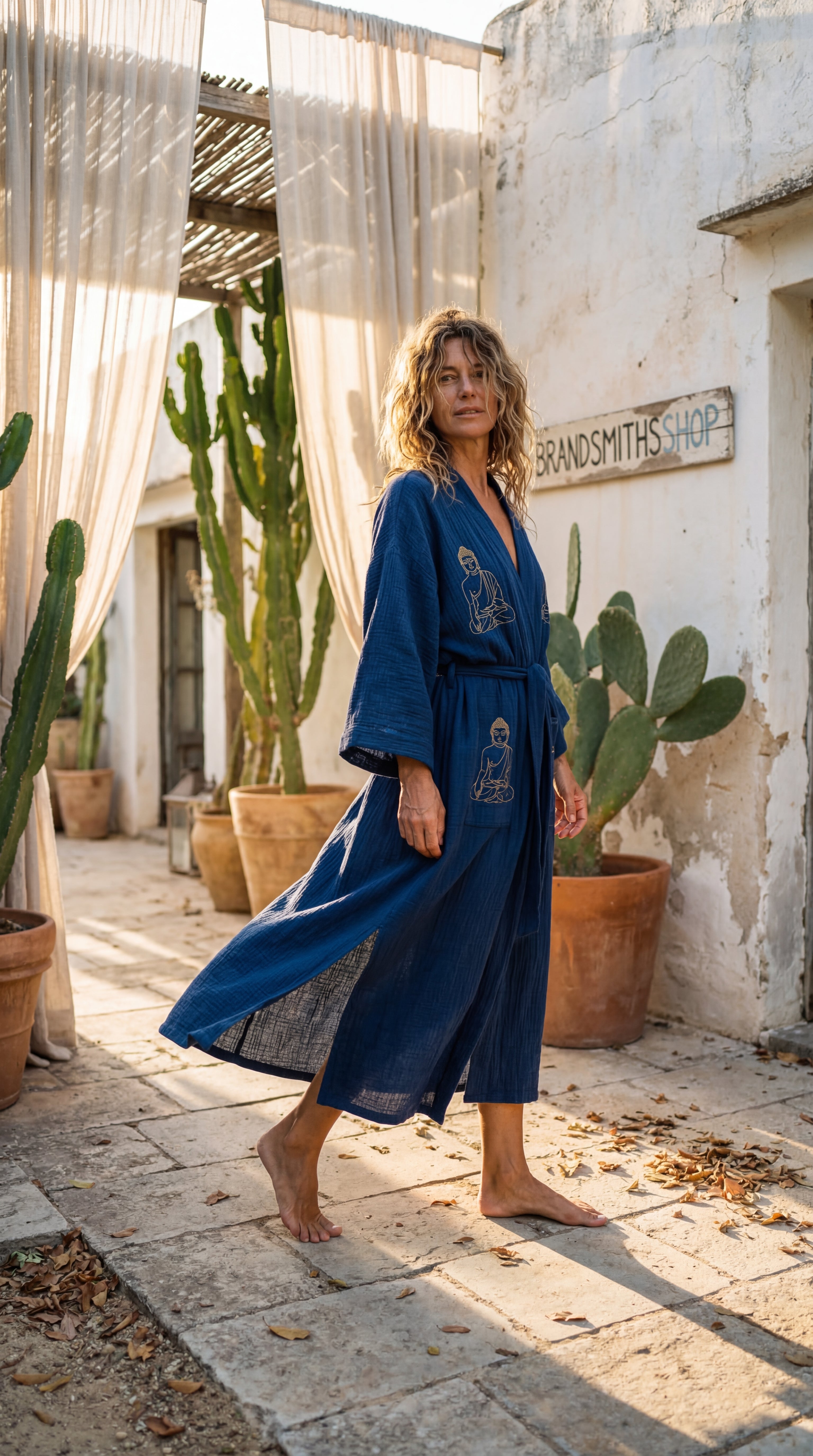 ولدت الصورة الظلية الأكثر شهرة لعلامتنا التجارية: هذا التصميم الخاص الذي يلتقي فيه قماش النيلي الغامق مع الخطوط الذهبية. لم يكن هذا مجرد زي عطلة فاخر، بل كان بيانًا لرحلة داخلية. تمزج الأناقة الروحية بشكل مثالي مع راحة الحياة اليومية.