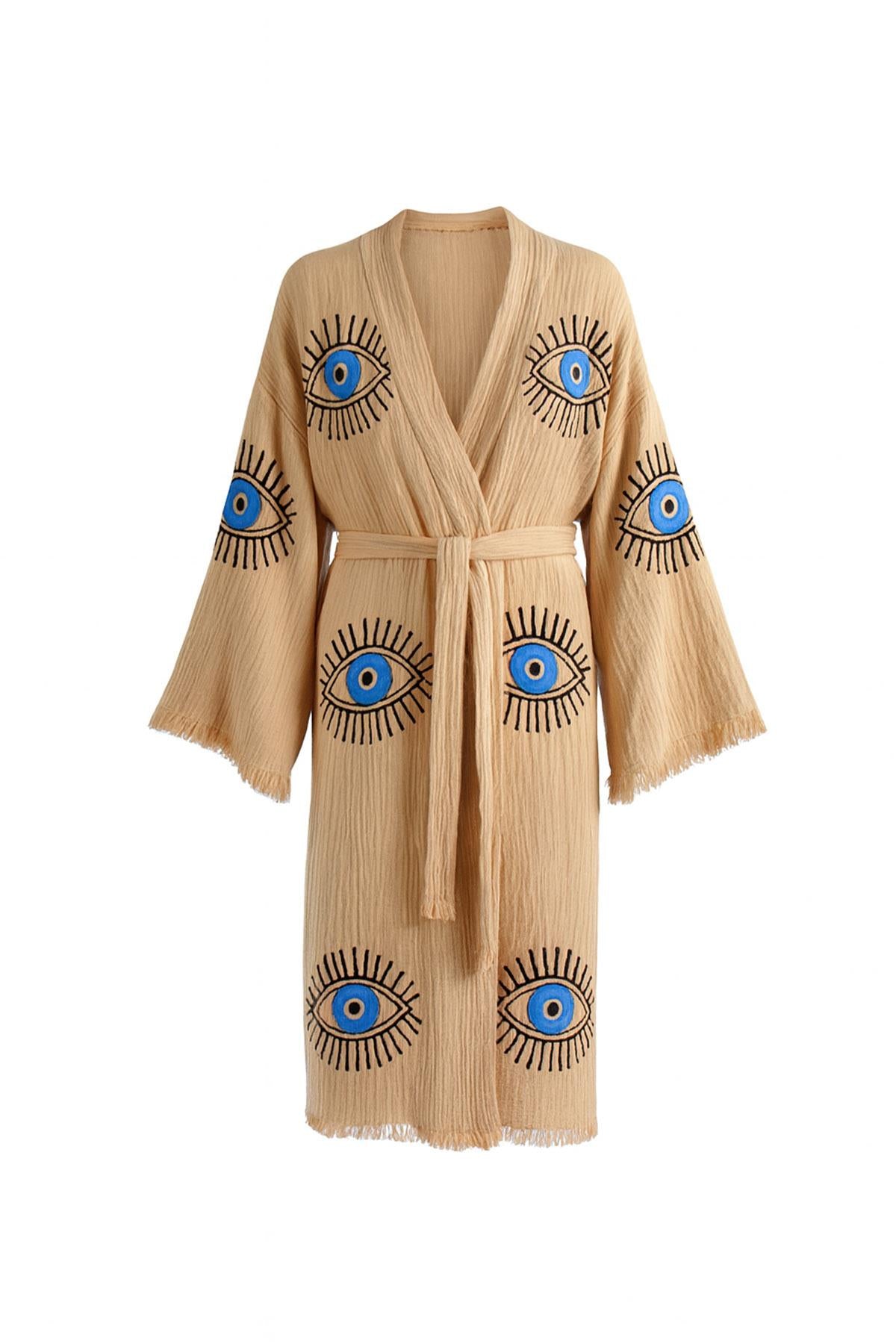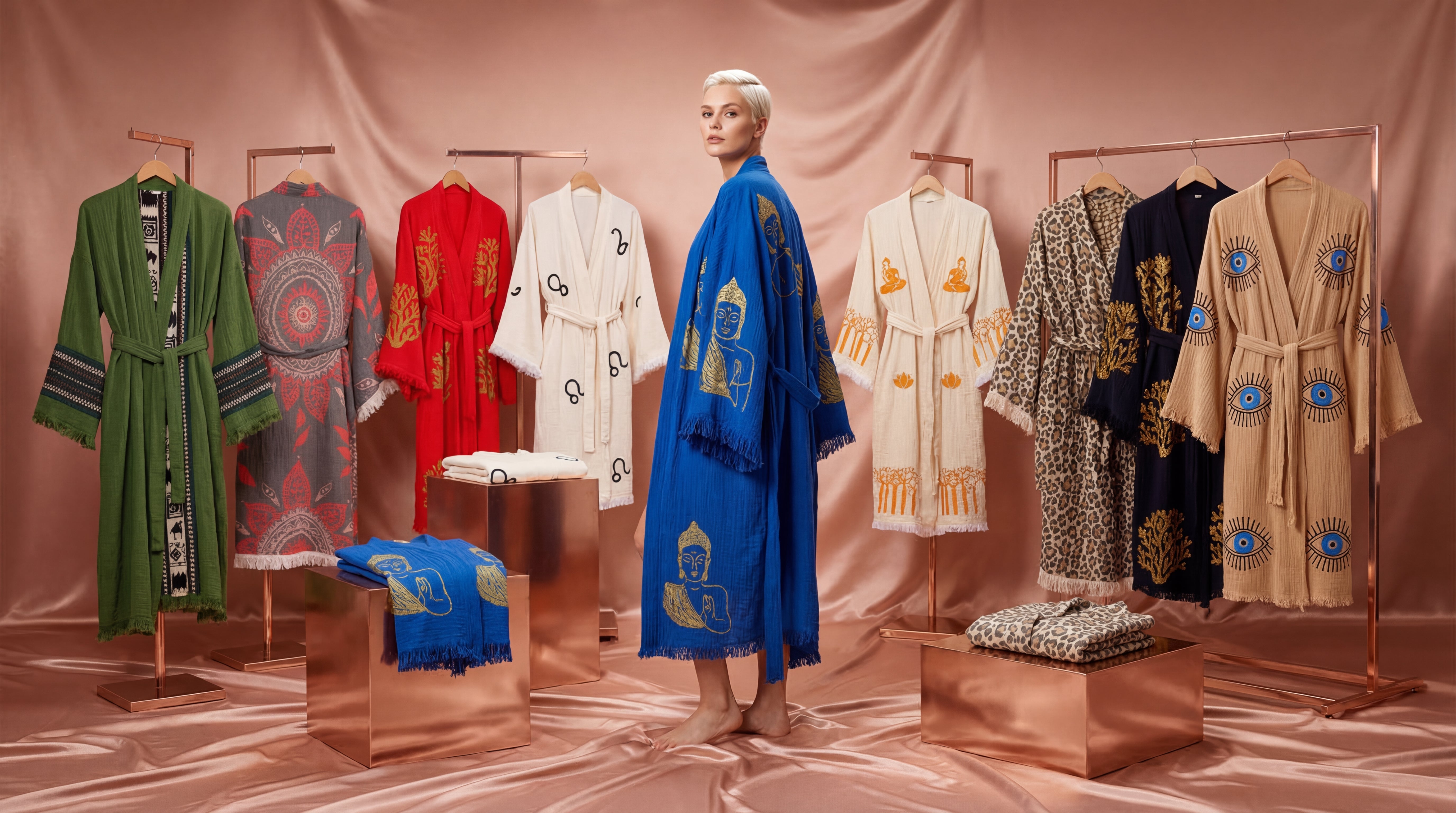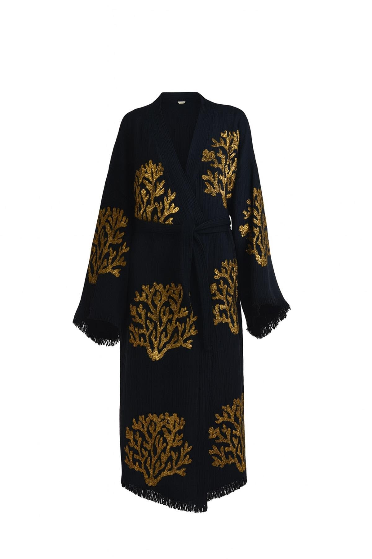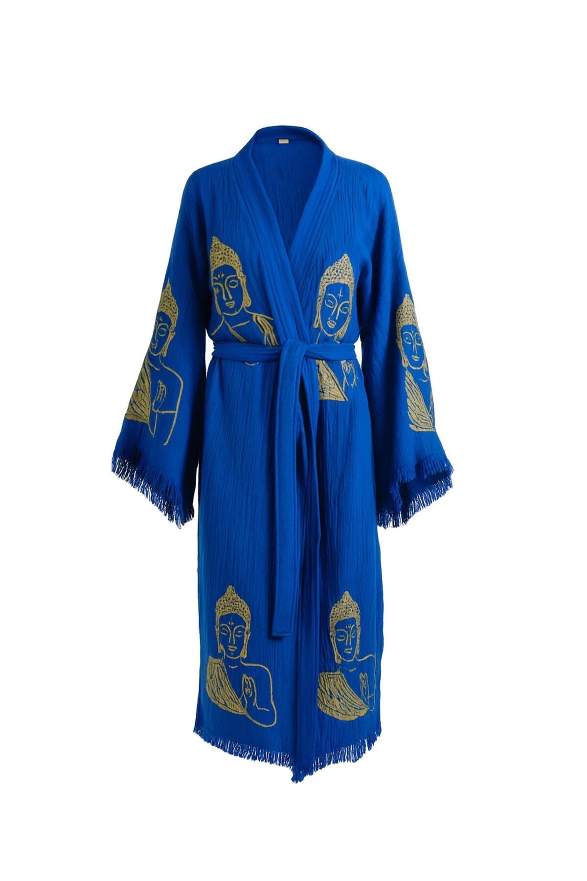 ولدت الصورة الظلية الأكثر شهرة لعلامتنا التجارية: هذا التصميم الخاص الذي يلتقي فيه قماش النيلي الغامق مع الخطوط الذهبية. لم يكن هذا مجرد زي عطلة فاخر، بل كان بيانًا لرحلة داخلية. تمزج الأناقة الروحية بشكل مثالي مع راحة الحياة اليومية.