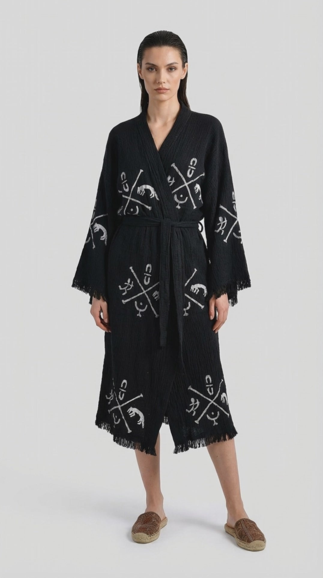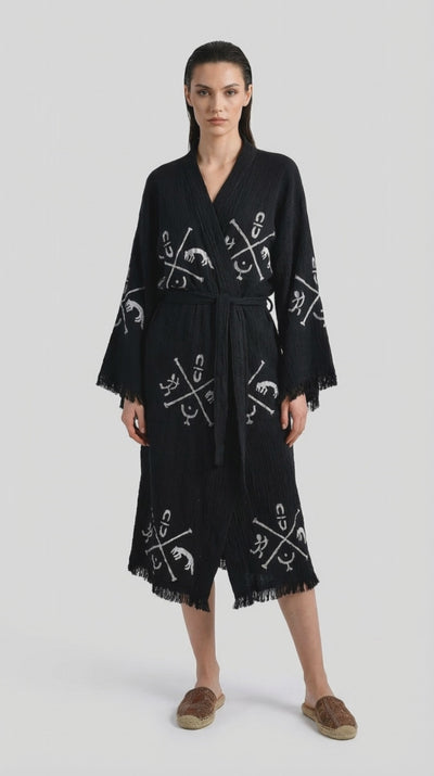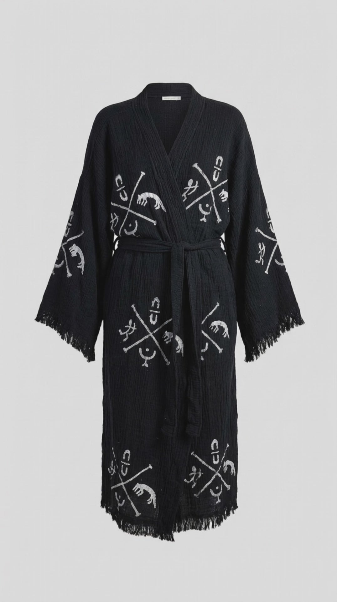 كيمونو Mystic Seal هو قطعة يمتزج فيها التصميم التقليدي مع الأناقة العصرية. يضمن قماشه الناعم وقصته الانسيابية الراحة والأناقة في كل حركة.