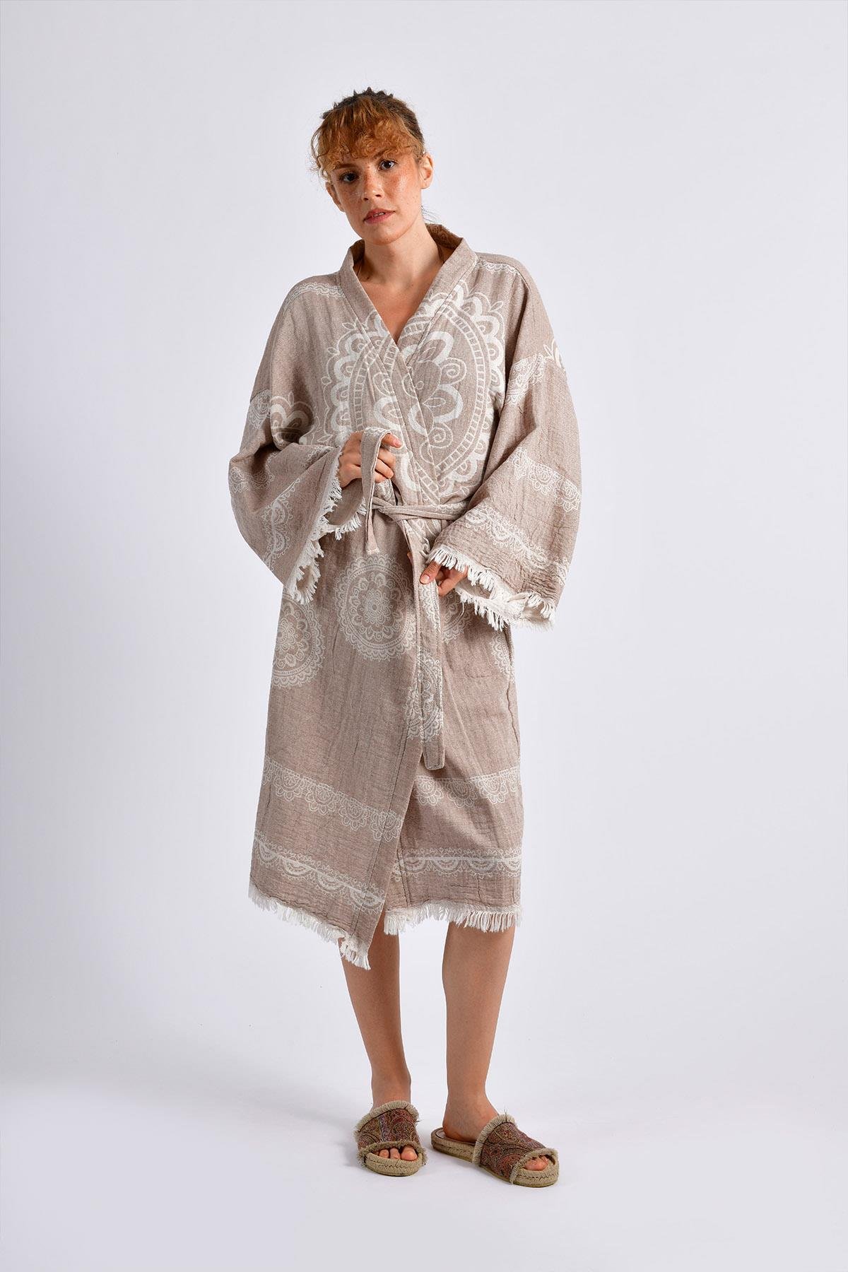 This kimono, representing calm and centeredness with its mandala pattern placed on a beige background, offers comfort and style with its double-layered texture.