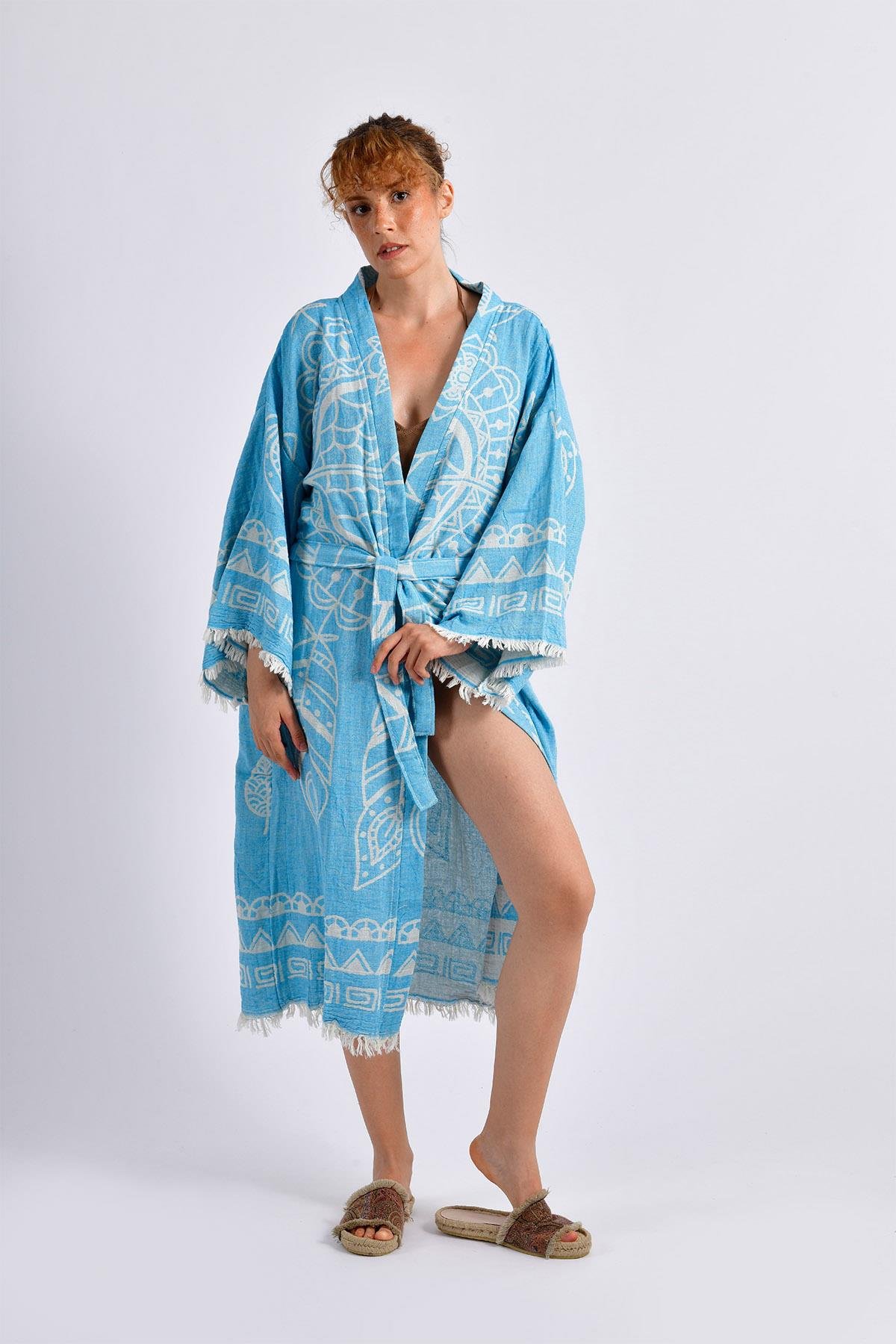 This double-layered blue kimono, adorned with ethnic dreamcatcher motifs, is a unique piece for those who love bohemian style.