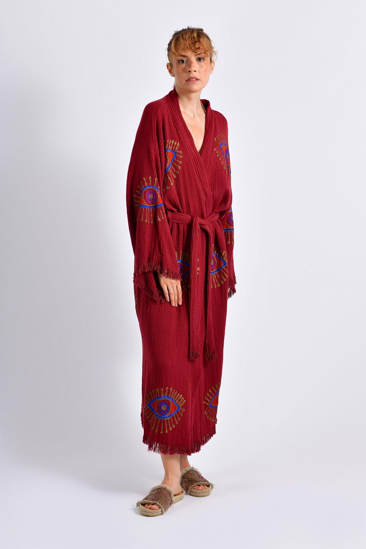 The eye is a symbol of intuition and inner awareness. The Vision Guard Kimono represents seeing beyond the gaze. Crafted with a hand-printed stone print technique, this kimono offers both elegance and comfort with its 100% cotton fabric.