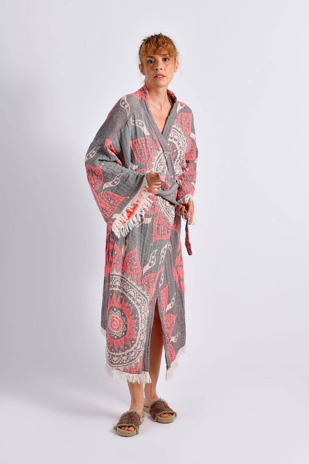 This gray three-layer kimono, enlivened with orange mandala motifs, represents inner balance and dynamism.