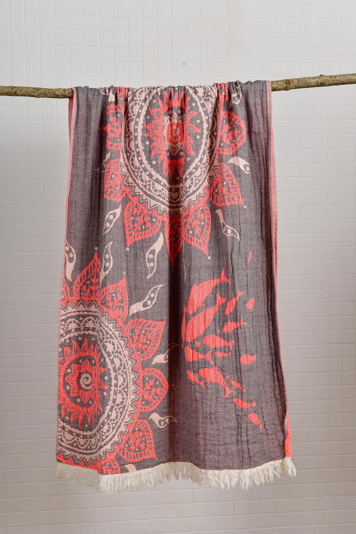 Adorned with mandala symbols, this peshtemal stands out with a balanced blend of grey and orange. Its triple-layered 100% cotton fabric ensures comfort and absorbency. Comes with a matching kimono design.