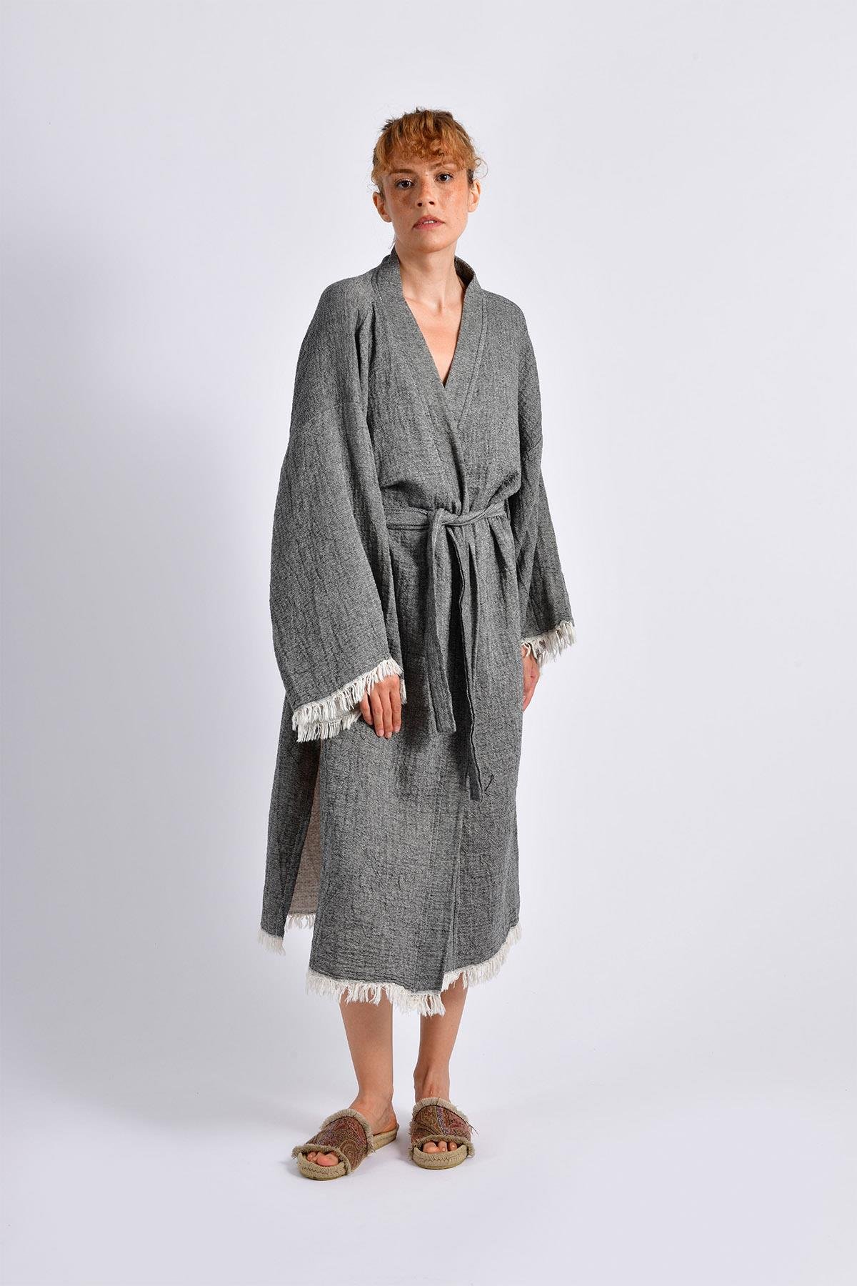 This three-layered gray kimono, with its slit detail providing freedom of movement, offers a timeless and simple look.