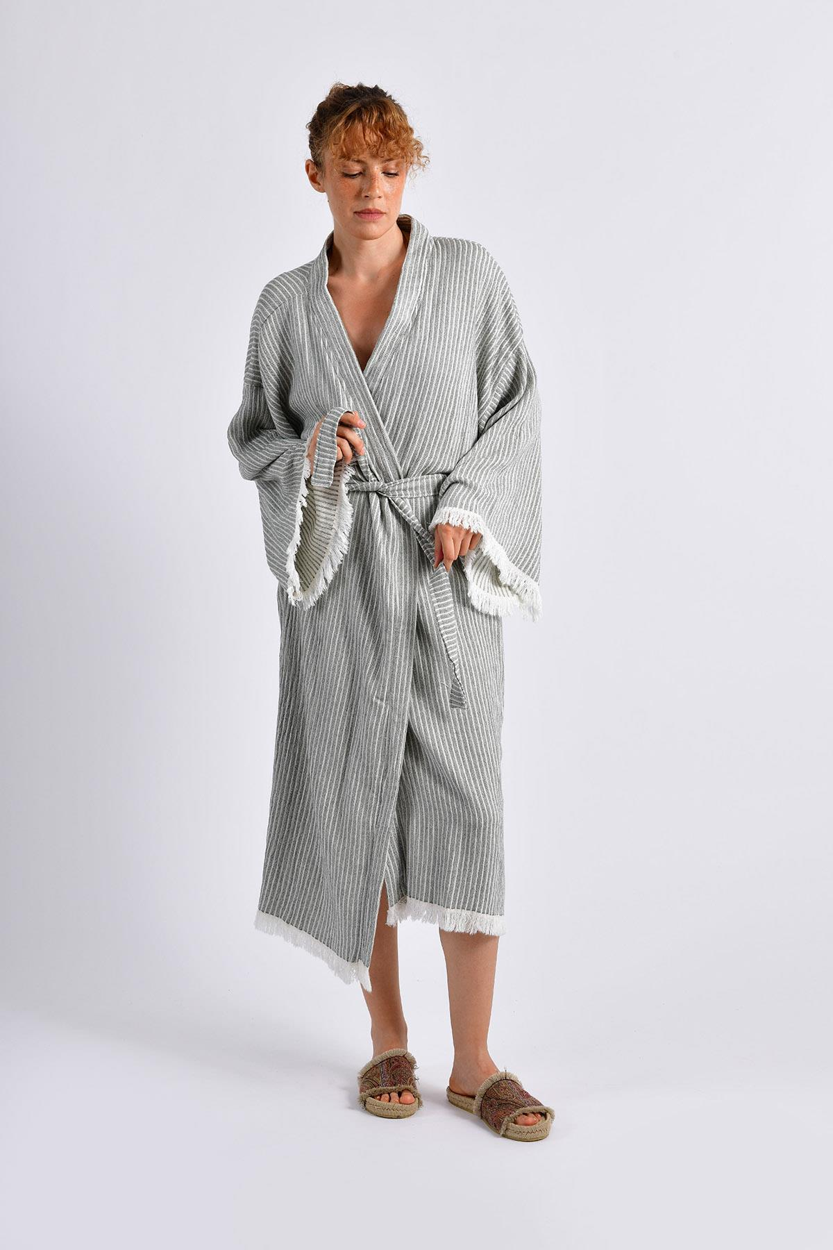 This kimono, with its elegant gray-toned striped pattern, offers a modern and simple look. Its double-layered structure provides everyday elegance.