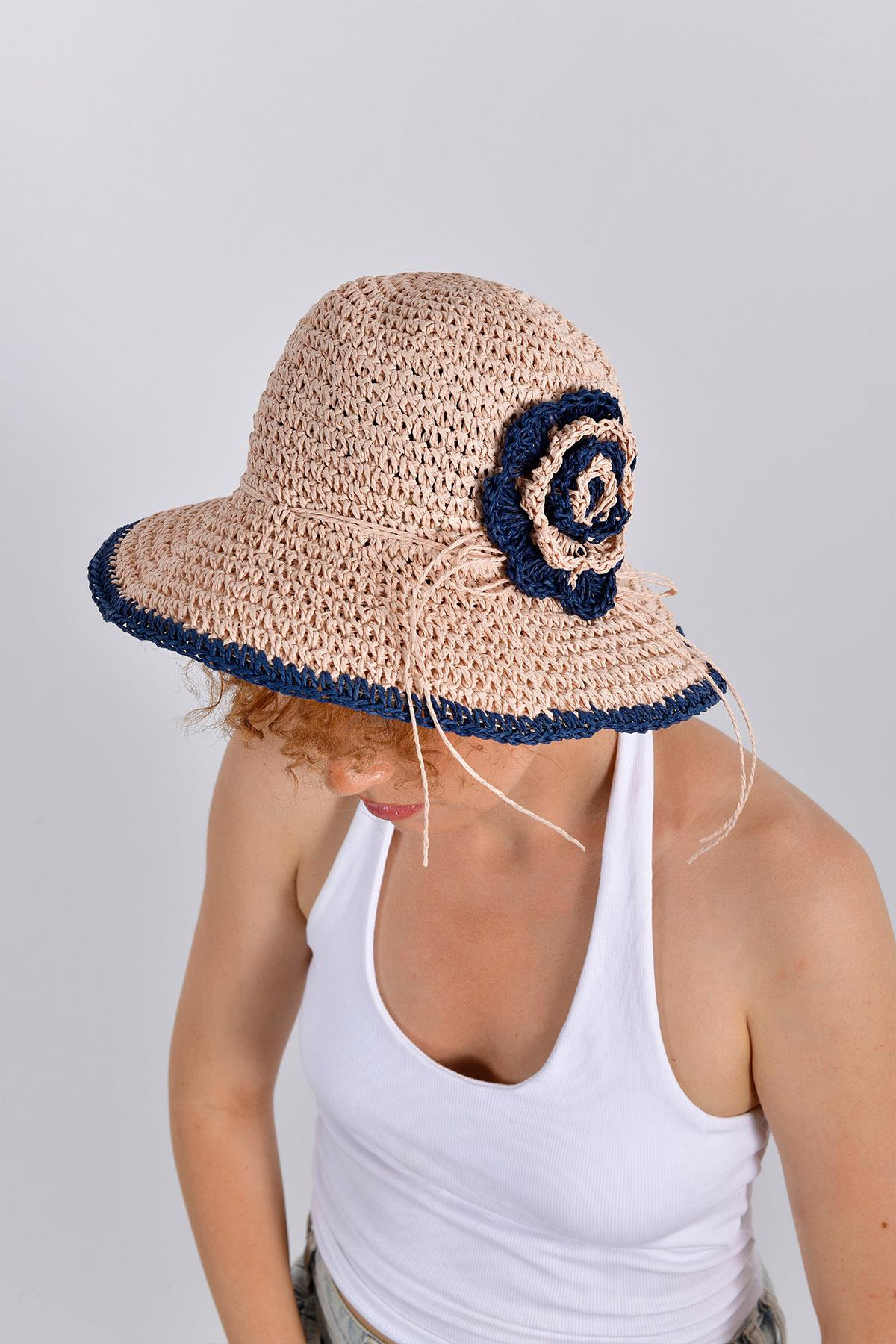 This handmade cream crochet hat features a navy spiral flower detail for a nostalgic yet elegant look. Its wide brim provides gentle sun protection while adding a charming retro twist to your outfit.