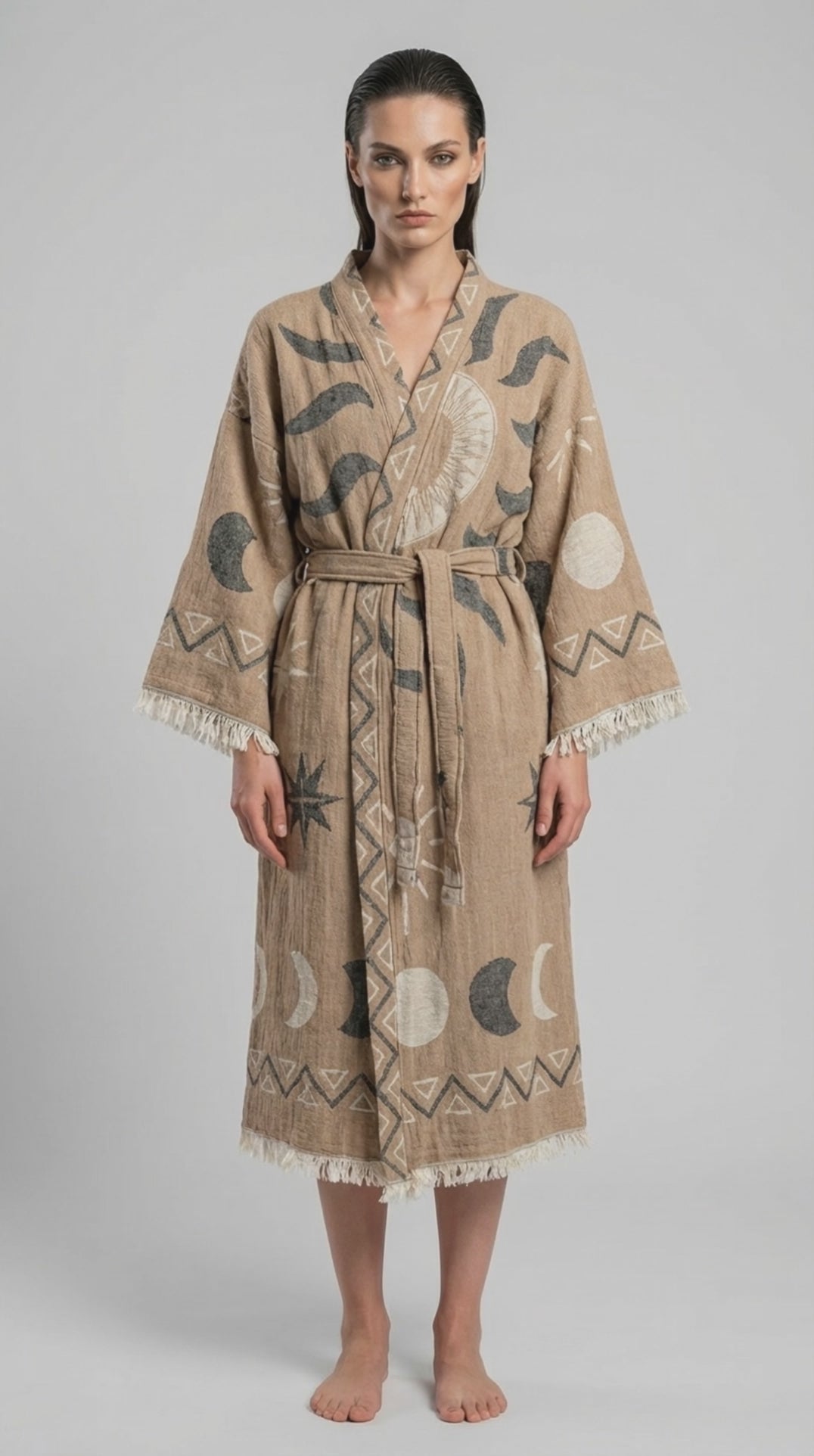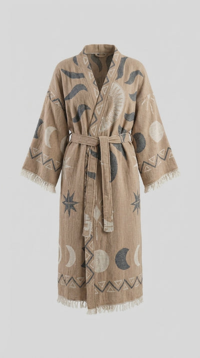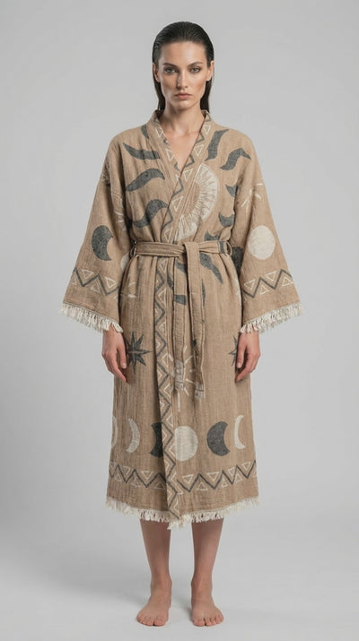 Beige Sun Kimono, hafif ve şık tasarımıyla yazın en vazgeçilmez parçası. Doğal beige tonuyla her kombinasyona uyum sağlayan bu kimono, güneşten korunurken zarafet katıyor.