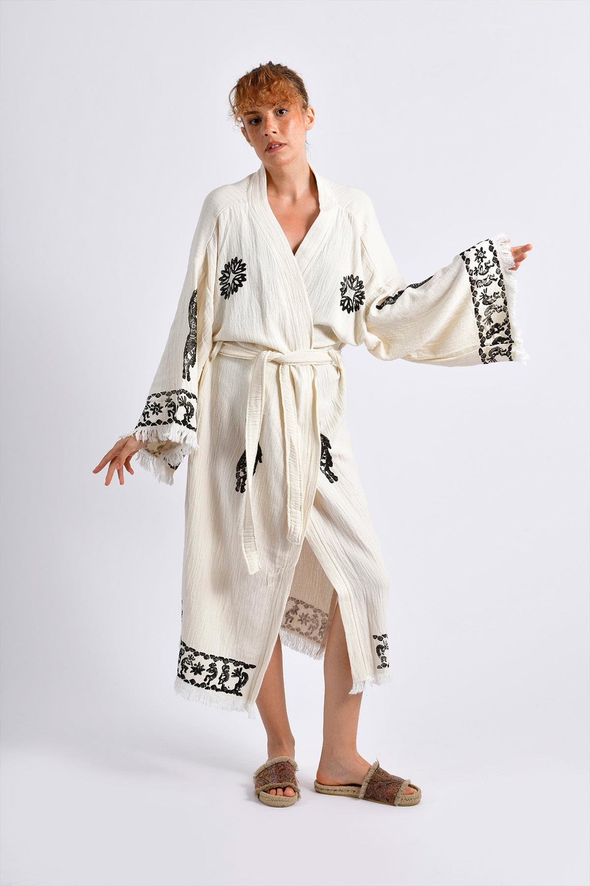 Inspired by the mysterious patterns of the East, this unique motif represents the balanced dance of shadow and light. The Shadow Bloom Kimono combines depth, nobility, and originality.