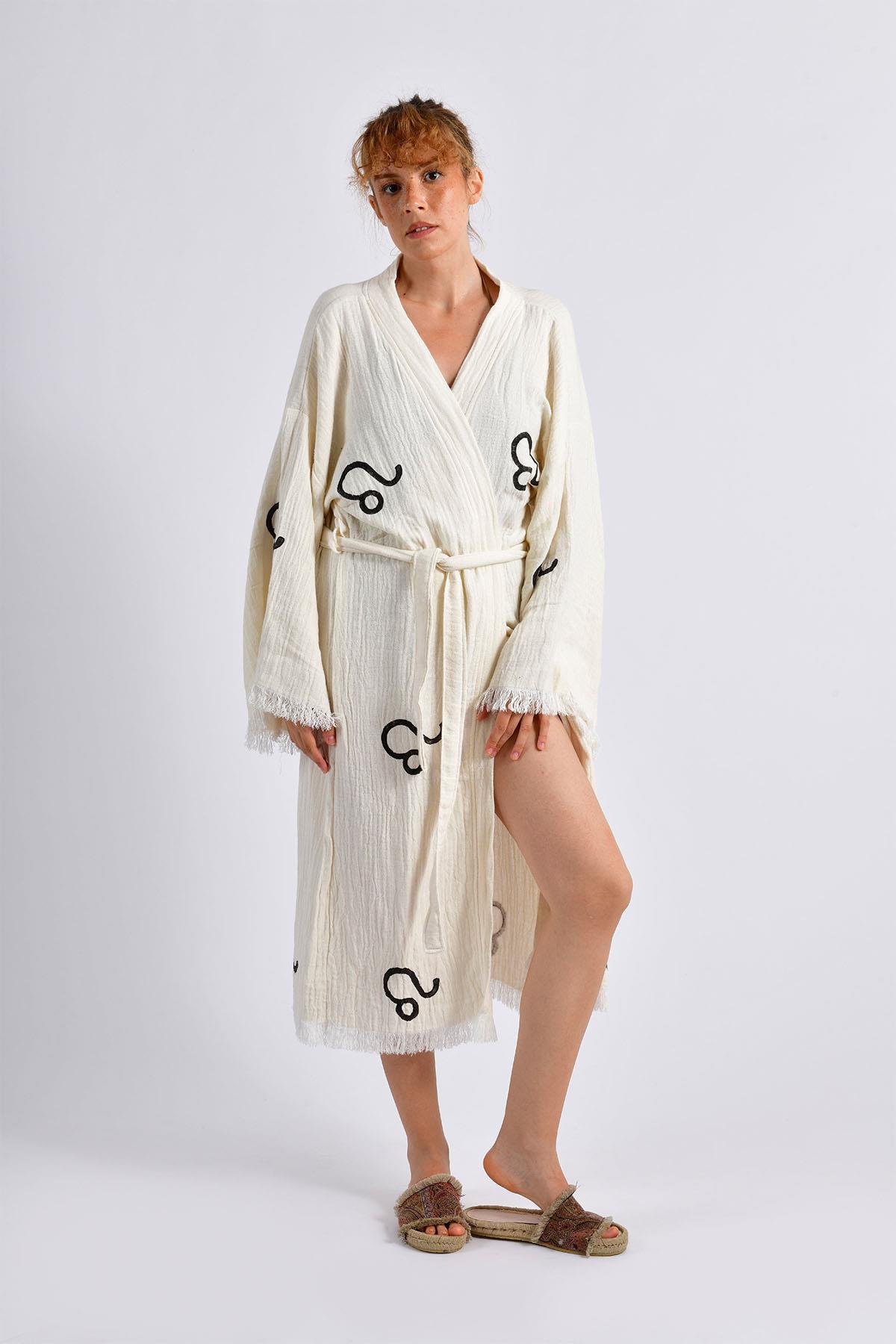 MİRA Inspired by the zodiac signs, the language of the sky, this design combines personal meanings with your style. The Zodiac Trace Kimono is crafted from handmade stone prints and cotton fabric.